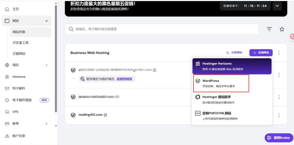 meiling412.com),建议选.com最通用。 - 选择用途: 系统问你要做什么网站?选「建立新网站」 -> 「WordPress」。